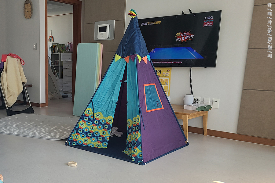인디언 텐트 낮에 가지고 놀던거라... ㅎ 지금은 분해했습니다. 벽걸이 TV선정리는 케이블 타이로 잡아주고 TV 뒷면 고정부에 공유기를 묶어뒀습니다. KT를 사용하고 있어 음성인식이 되는 제품의 경우 구조상 걸치는 것이 안되어 이사올 때 가지고 왔던 좌식탁상에 올려뒀죠. 덩그러니 놓여있다보니 보기도 그렇고 제품 하나 올려두기 위해 사용하는 공간으로 불필요했기에 무타공 TV선반을 구매하여 올렸습니다.