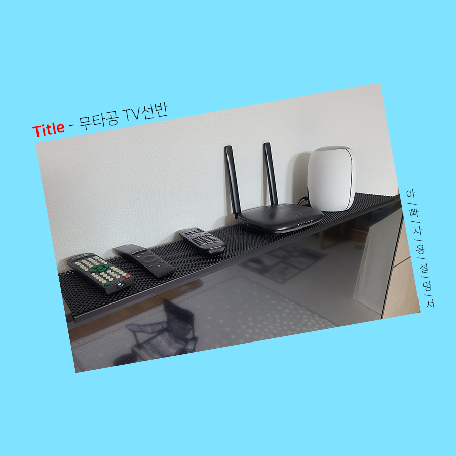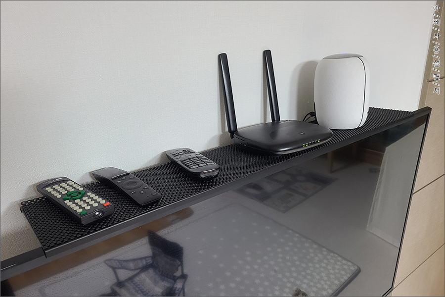 'ㄱ' 자 형태로 TV 앞쪽을 살짝 가리기 때문에 베젤이 적으면 이 부분이 거슬릴 수 있기 때문이죠. 물론 스크래치를 방지하기 위해서 안쪽에 보호커버가 살짝 씌워져있기는 하지만 쿠션감이 있거나 하지는 않습니다. 상단에는 올려두는 제품들이 쉽게 미끄러지지 않도록 미끄럼방지 패드를 올려두고 그 다음 공유기와 음성인식기기, 그리고 리모컨을 두었습니다.